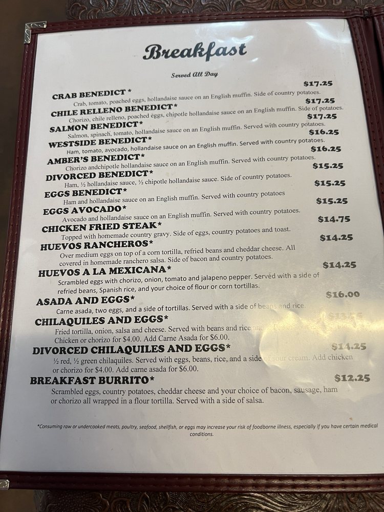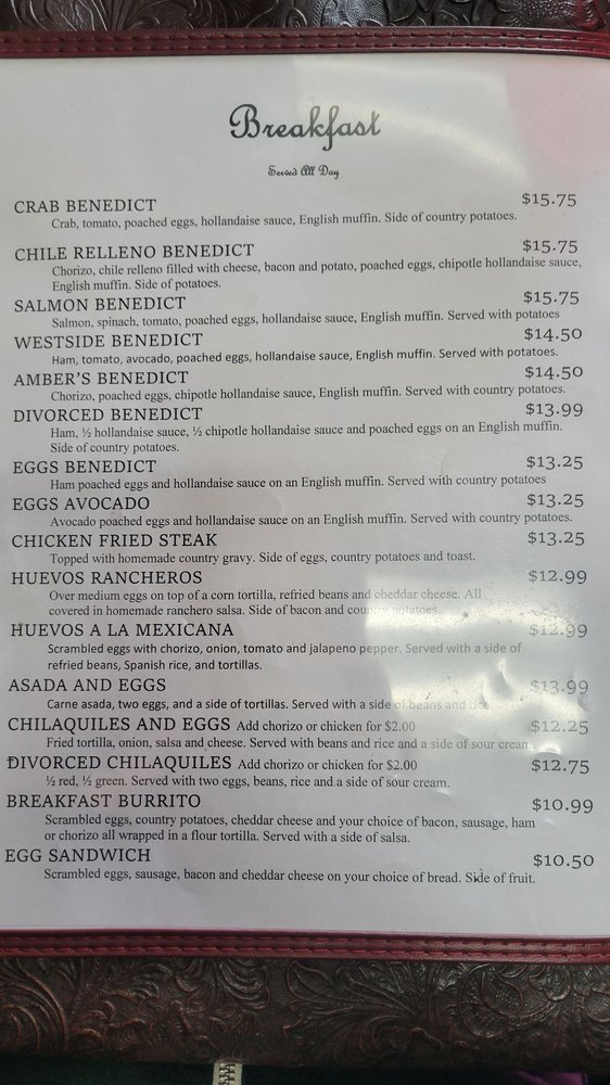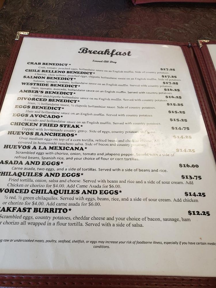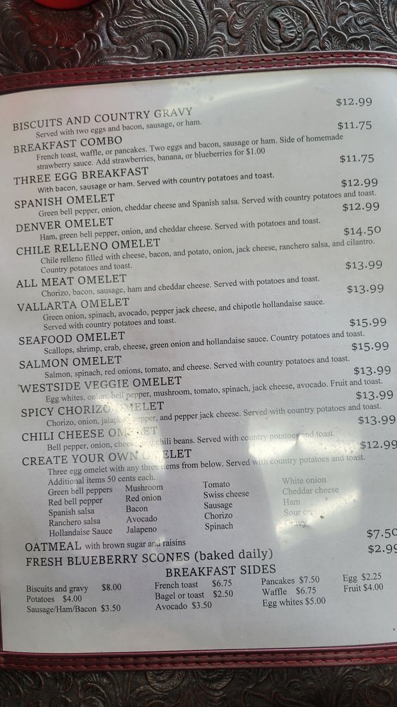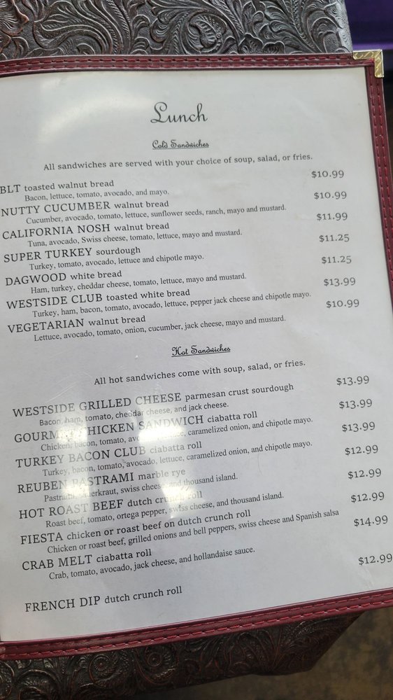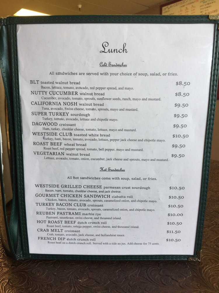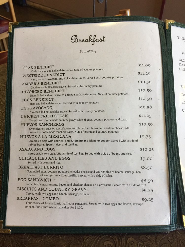 Introducing the menu at Westside Cafe & Coffee Company, located in Reno, NV, offers a cozy atmosphere perfect for breakfast and brunch. The menu features delicious dishes like Crab Benedict, Chile Relleno Benedict, and Salmon Benedict, all served with a side of country potatoes. For lunch, try the BLT Sandwich or the Nutty Cucumber Sandwich. Customers rave about the friendly staff, fair prices, and generous portions. The breakfast burrito is a standout, packed with ham, sausage, and bacon. While the interior may not be fancy, the food is delicious and great value for money. Don't miss out on the Blueberry Scone and Biscuits and Gravy for breakfast or the California Nosh Sandwich for lunch. Westside Cafe & Coffee Company is a local gem worth supporting for a satisfying dining experience.